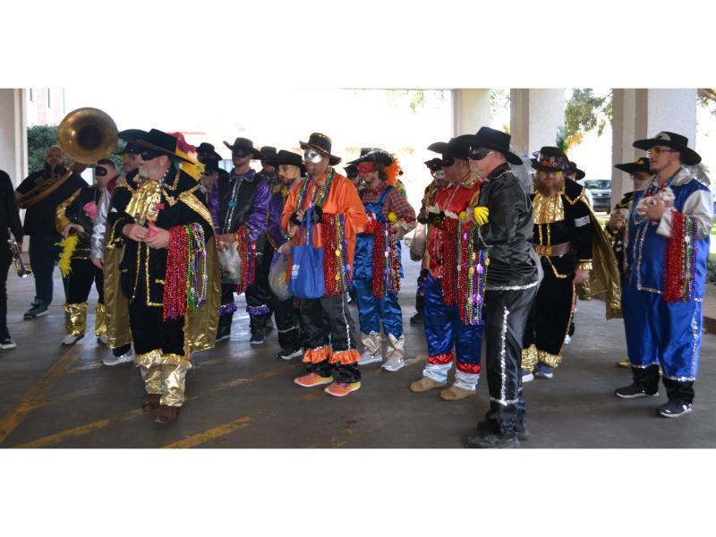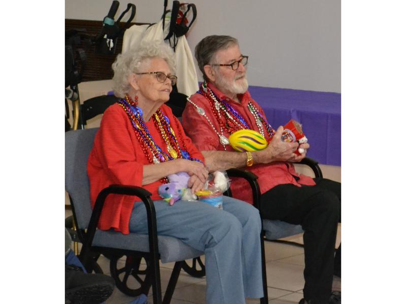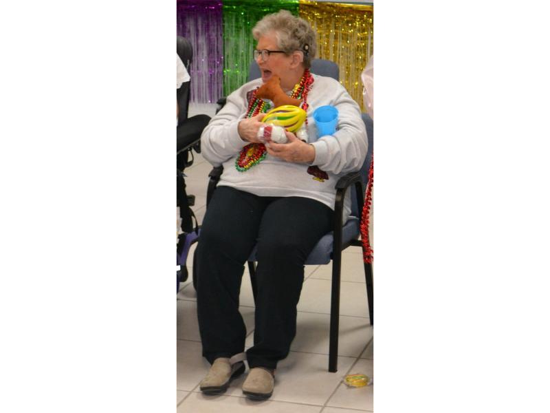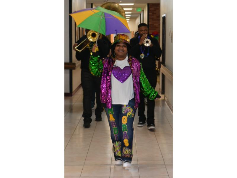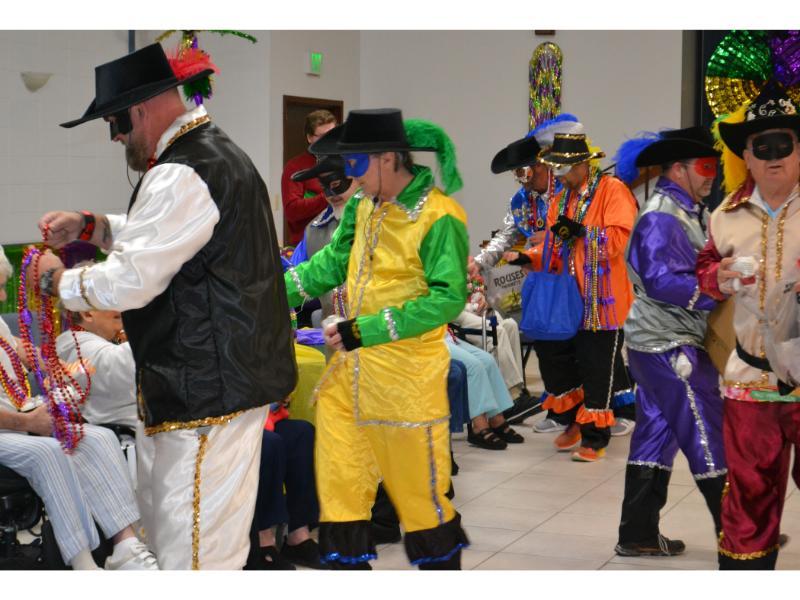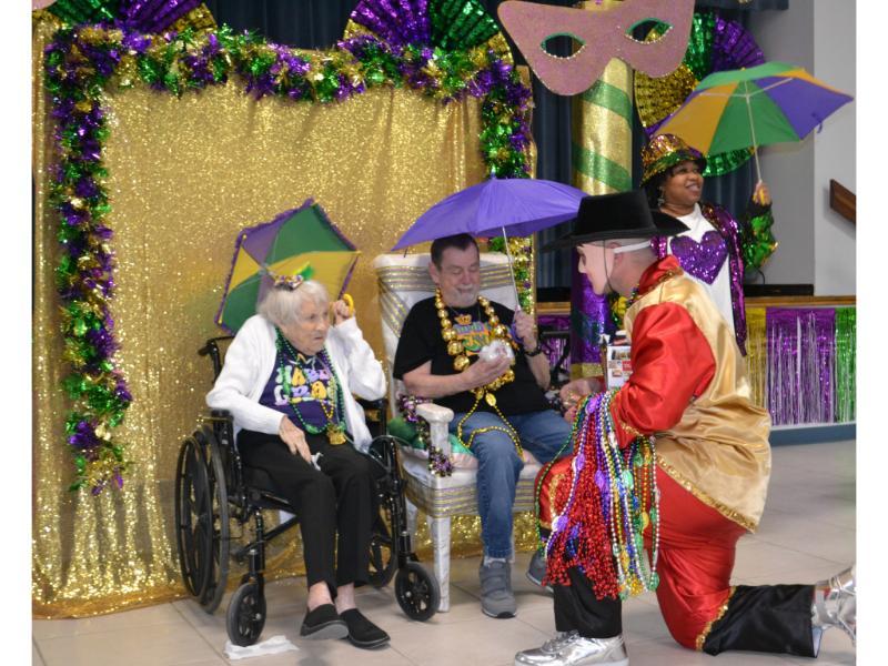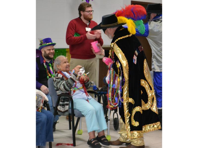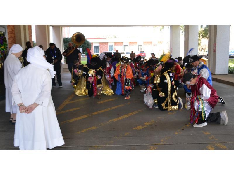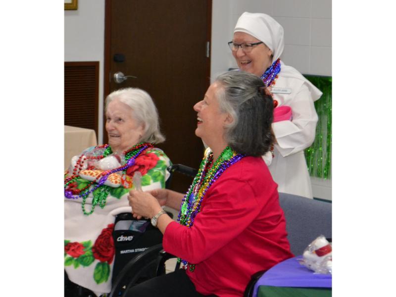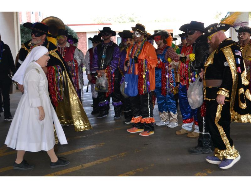 Let the good times roll! Each year we celebrate this wonderful time of year in the city that started Mardi Gras! The Residents got to help kick off the festive season by enjoying a parade by a local Mardi Gras organization, the Conde Cavaliers! They came filled with beads, moon pies, throws and fun to share with everyone at Sacred Heart Residence. After receiving a blessing from Mother Margaret, the Conde Cavaliers began their parade through the Home and filled the halls with music, decorations, laughter, dancing and tons of fun!